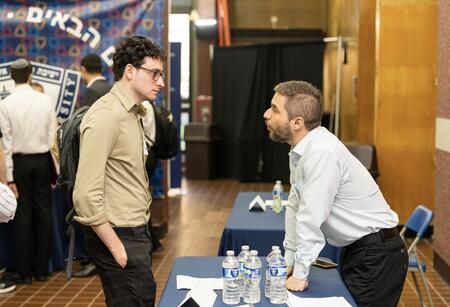 Katz School alum Jesus Olivera, right, dispenses advice to a student at a recent YU career fair.